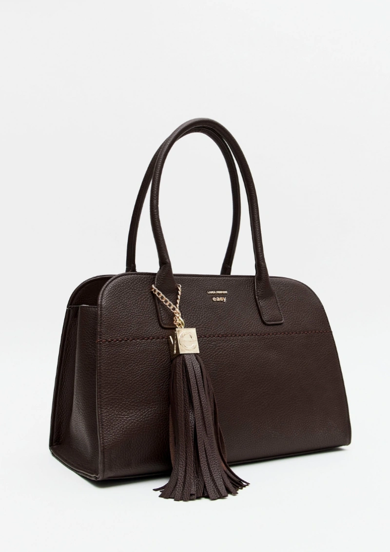 O interior é amplo, com bolso interno para praticidade. O detalhe metálico frontal com logo lança perfume adiciona sofisticação atemporal.