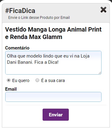 A Dani Banani está aqui para facilitar a sua vida! Agora você pode enviar aquela dica pra sua amiga ou para o seu amor e propagar o seu bom gosto por aí.